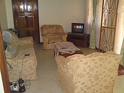 Living Room: 3-7piece seater, coffee table, TV, DVD Player, Radio and a fan.