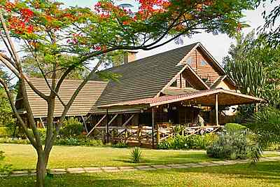 The terrace restaurant with views of the mountains, Meru and Kilimanjaro, overlooks the tropical gardens and a large solar-heated swimming pool.