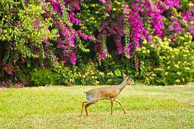 The lodge property is spread over 12 acres (circa 50,000 m2) of landscaped gardens and natural African bush land, bordering on a seasonal river bed lined with huge old trees. Many species of birds can be viewed and we also have a number of small animals like Dikdiks within the grounds.