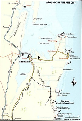 Situated 25 km from provincial capital Inhambane with International Airport and 480 km north of Mozambique capital Maputo. Access by road is a pleasant drive on tarred road except for the last 18km on a dirt road through coconut and cashew nut groves, which is suitable for the passage of an ordinary vehicle.