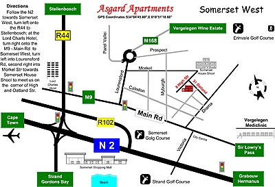 Asgard Apartments offer sunny blue skies, breathtaking views of the Mountain range and stunning Winelands, and are in close proximity to the shopper's paradise of Somerset Mall, popular golf courses and the beautiful beaches of Strand and Gordon's Bay – both part of the warm Indian Ocean.