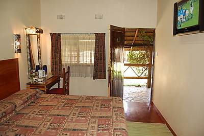 Rooms are air conditioned and furnished with African theme - African print duvets, mirrors and a wooden braced closet and bed frames, giving it a warm homely feeling. Romm come with telephone, safe, mosquito nets, coffee making facilities and TV (LCD/Plasma 27" TV for upgraded rooms & mini fridge) .