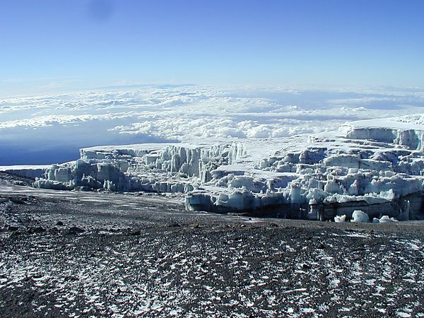 In the morning, you hike east over intervening ridges and valleys to join the Mweka Route, which will be your descent route. Turn toward the mountain and hike up the ridge through sparse landscape for another hour to the Barafu Hut. The famous snows of Kilimanjaro are far above Barafu Camp near the summit of the mountain. Your camp is on a narrow, stony, wind-swept ridge, so make sure that you familiarize yourself with the terrain before dark to avoid any accidents. Prepare your equipment and warm clothing for your summit climb, and drink a lot of fluids.